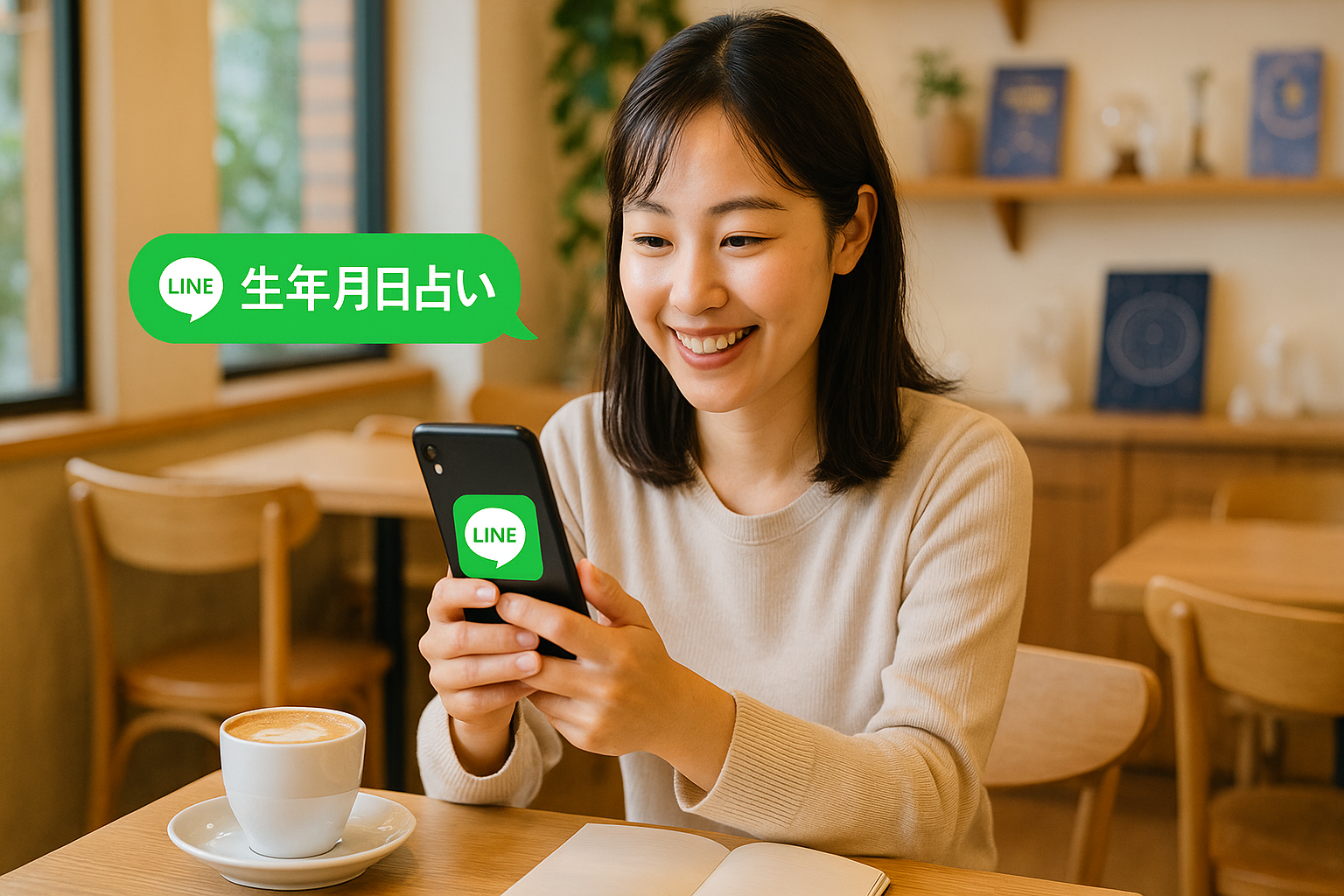 この生年月日占い、実は福岡のおしゃれなカフェでも話題なんですよ。でも今は、LINEでカンタンに申し込めちゃうから、どこに住んでてもOK!私も移動中に公式LINEをポチッと追加して、気軽に占ってもらいました☆